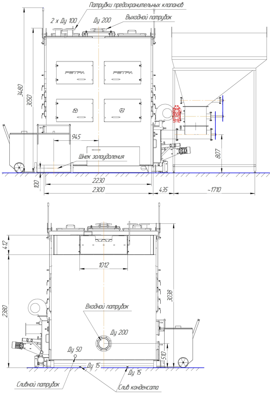 Конструкція котла передбачає його експлуатацію разом з електронним пультом керування, вентилятором піддування та приводом шнека та насадкою пальником.